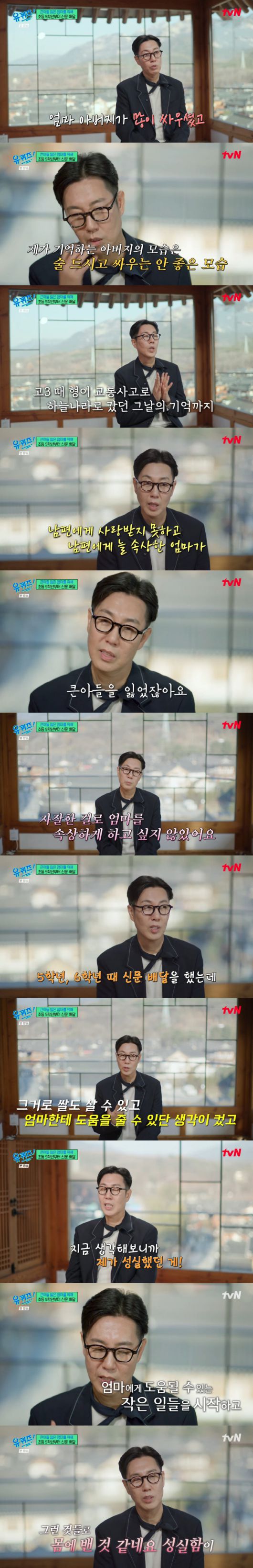 김영철은 "자잘한 걸로 엄마를 속상하게 하고 싶지 않았다"며 "5, 6학년 때 신물 배달을 했는데 그거로 쌀도 살 수 있고 엄마한테 도움을 줄 수 있단 생각이 컸다"라면서 큰아들을 잃은 엄마를 위해 열심히 살았던 당시를 떠올렸다.