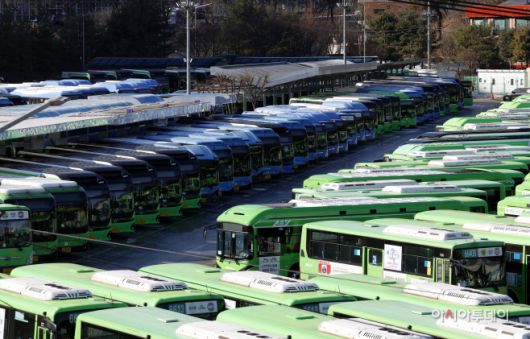 서울 시내버스 노조가 전면파업에 돌입한 지난 13일 서울 양천구 공영차고지에 시내버스가 주차돼 있다. /정재훈 기자 |