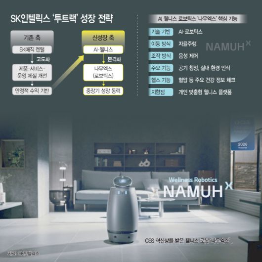 이와 함께 SK인텔릭스는 웰니스를 새로운 성장 축으로 키우고 있다. 지난해 10월 선보인 웰니스 브랜드 '나무엑스'가 대표 사례다. 나무엑스는 실내 환경을 인식해 공기를 관리하고, 비접촉 방식으로 체온·맥박·산소포화도 등 주요 건강 지표를 확인할 수 있는 기능을 갖췄다. 단순 가전이나 헬스케어 기기를 넘어 일상 공간에서 활용 가능한 웰니스 관리 플랫폼으로 확장하고 있으며, 공간 이동과 음성 인터페이스를 통해 사용자와 상호작용이 가능하다.
