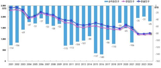 [서울=뉴시스] 이재은 기자 = 지난 24년간 서울을 떠난 인구수는 2001년 75만1000명에서 2024년 47만3000명으로 감소했다.