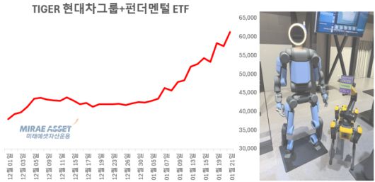 미래에셋자산운용의 ‘TIGER 현대차그룹+펀더멘털’ ETF 추이(왼쪽)와 미국 보스턴다이내믹스(BD)가 공개한 휴머노이드 로봇 ‘아틀라스’(오른쪽). 그래픽=임성영 기자 |