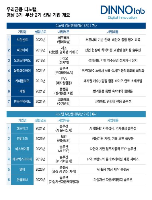 2016년에 시작된 디노랩은 우리금융이 미래 성장 동력을 확보하고, 혁신 기술을 보유한 스타트업과 상생 생태계를 구축하기 위해 운영하는 스타트업 발굴·협력 프로그램이다. 부산과 경남센터를 포함해 국내 6개 센터와 베트남 1개 센터를 운영 중이다. 현재까지 AI(인공지능), 핀테크(금융기술), 소재·부품·장비(소부장) 등 각 분야에서 총 219개사를 발굴했다.