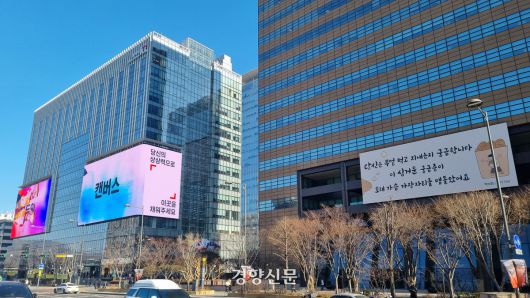 21일 오후 서울 광화문광장 교보빌딩에 설치된 광화문글판. 바로 옆 KT빌딩 대형 전광판에서 광고 영상이 송출되고 있다. 배재흥 기자 |