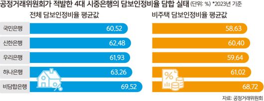 실제 공정위가 파악한 4개 시중은행의 전체 LTV는 2023년 기준 국민은행 60.52%, 신한은행 62.48%, 우리은행 61.93%, 하나은행 63.26%로 60% 초반대에 머물러 있다. 반면 나머지 은행의 평균은 69.52%로 4개 은행보다 7.5%포인트 높게 형성돼 있었다. 공장과 토지 등 비주택 LTV는 국민은행 58.63%, 신한은행 60.40%, 우리은행 59.64%, 하나은행 61.02%로 비담합은행의 68.72%보다 8.8%포인트 낮았다.