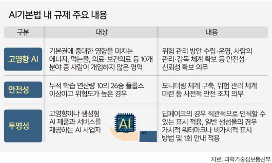 AI 기본법은 산업 경쟁력을 높이기 위해 3년마다 ‘인공지능 기본계획’을 수립도록 하는 등 AI 산업 진흥에 초점을 맞췄다. 다만 AI 기본법 내 규제를 두고 기업 성장 저해 요소란 우려가 잇따르고 있다. 정부가 계도기간을 유예하더라도 규제 대응 체계를 마련하는 것 자체가 중소 AI 기업들에 큰 부담이어서다.