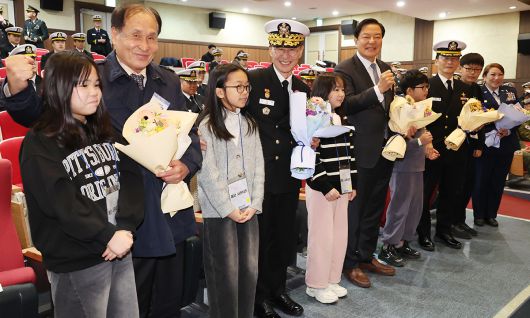 21일 부산 해군작전사령부에서 열린 ‘제15주년 아덴만 여명작전 기념행사’에 참석한 석해균 당시 삼호주얼리호 선장(왼쪽 두번째)과 김경률 해군작전사령관( 〃 네번째), 황기철 전 해군참모총장( 〃 여섯번째), 이국종 국군대전병원장( 〃 여덟번째)이 해군서포터즈 학생들에게 꽃다발을 받고 기념촬영을 하고 있다. 부산=연합뉴스 |