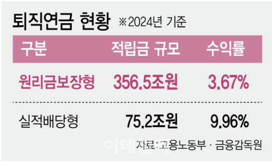 퇴직연금 적립금은 2024년 말 기준으로 431조 7000억원까지 불어났다. 이중 가입자가 운용에 관여하는 실적배당형이 17.4%(75.2조원)에 머물렀다. 나머지 원리금보장형인 82.6%(356.5조원)는 방치 상태에 있는 것이다. 2024년 한해 연간 수익률을 보면 실적배당형이 9.96%로 원리금보장형 3.67%에 비해 2.7배 이상 높았다.