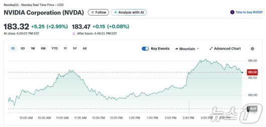 21일(현지 시각) 뉴욕증시에서 엔비디아는 2.95% 급등한 183.32달러를 기록했다. 이로써 시총도 4조4630억달러로 늘었다.