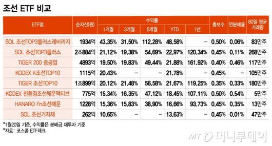 60일 평균 거래량도 SOL 조선TOP3플러스가 268만주로 가장 많다. ETF 순자산이 크고 거래량이 많으면 거래 회전율이 높으면 LP(유동성 공급자)는 경쟁적으로 호가를 제시하게 된다. 이 경우 호가 스프레드가 축소되고, 투자자는 보다 유리한 가격으로 ETF를 매수·매도할 수 있다.