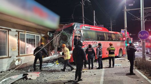 [원주=뉴시스] 이순철 기자 = 21일 오후 8시 8분께 강원 원주시 반곡동 국과수 앞 사거리에서 출퇴근 전세버스가 승용차와 충돌한 뒤 전봇대를 들이받았다.