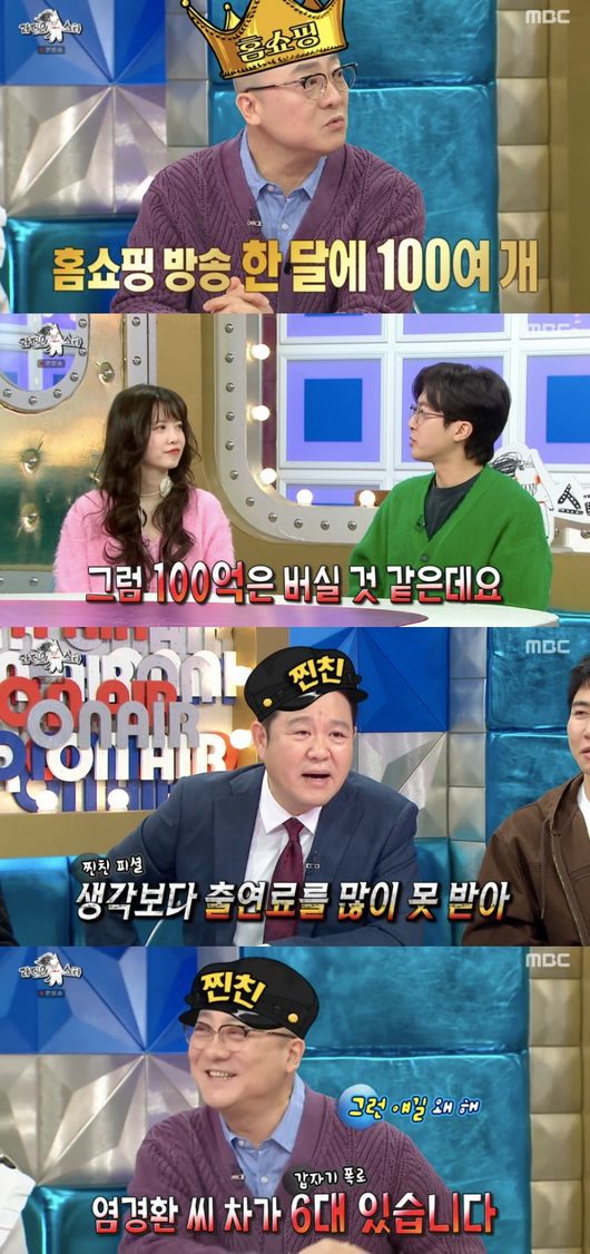 그러자 전민기는 “제가 홈쇼핑 출연료를 어느 정도 알고 있다”라며 몇 개 하는지 물었고, 염경환이 “저는 홈쇼핑 한 달에 100여 개 정도 한다. 1년에 1,500개 이상 된다”라고 하자 그는 “그럼 100억은 버실 것 같은데”라고 추측했다.