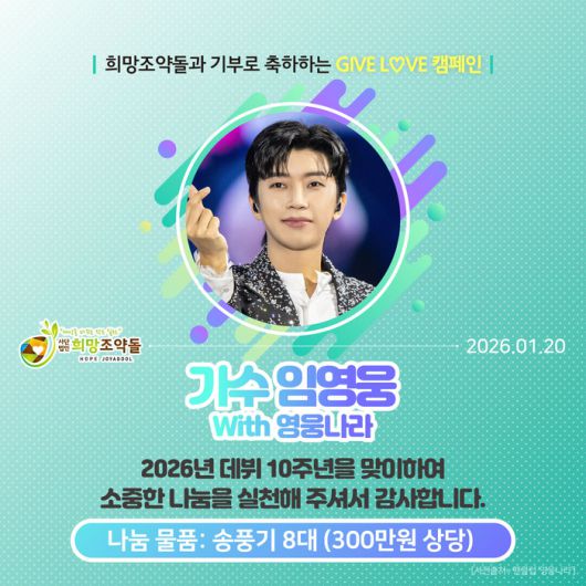 [스포츠서울 | 배우근 기자] 가수 임영웅 팬카페 ‘영웅나라’는 2026년 임영웅 데뷔 10주년을 맞아, 희망조약돌에 300만 원 상당 물품을 기부했다.