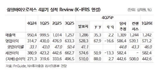 4분기 실적에 대해서는 일회성 요인에 따라 컨센서스를 하회한 것으로 분석했다. 한 연구원은 “4분기 매출은 1조2857억원으로 전년 대비 35% 증가했지만, 영업이익은 5283억원으로 컨센서스를 약 10% 하회했다”며 “배치 출하 타이밍 차이로 일부 매출이 4분기에서 1분기로 이연됐고, 에피스 분할 및 미국 공장 인수 관련 일회성 비용이 반영된 영향”이라고 설명했다.