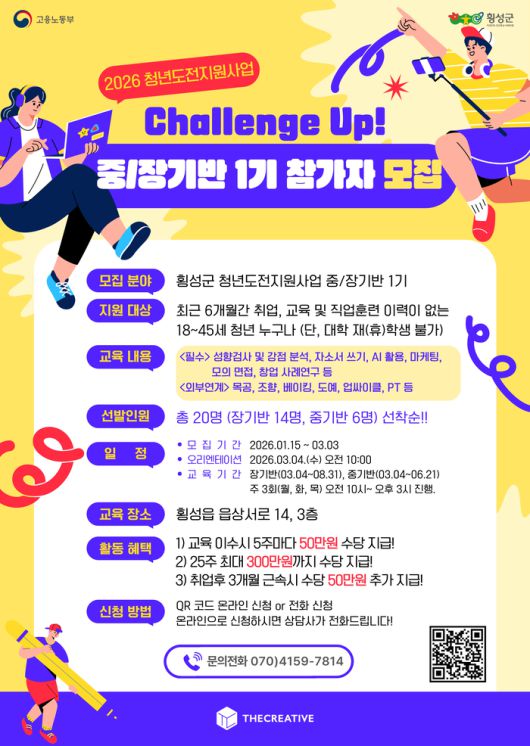 [스포츠서울ㅣ김기원기자]횡성군은 지역 청년들의 사회 진출과 성장을 지원하기 위해 ‘2026 청년도전지원사업’ 참여자를 모집한다고 밝혔다.