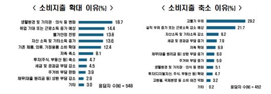생활환경이나 가치관의 변화 등 소비 인식 변화로 지출을 확대하겠다는 응답이 18.7%로 가장 많았고, 취업 기대 및 근로소득 증가(14.4%), 물가 안정 기대(13.8%)가 뒤를 이었다.