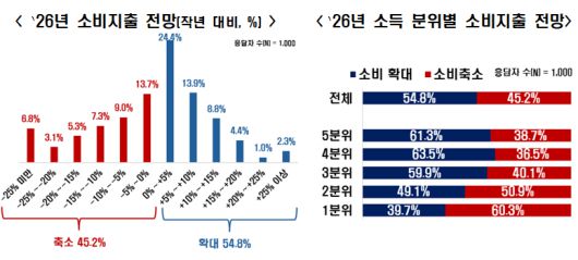 그러나 소득 수준에 따라 소비 심리는 뚜렷한 차이를 보였다. 소득 하위 40%(1~2분위)는 소비를 줄이겠다는 응답이 우세한 반면, 상위 60%(3~5분위)는 소비를 확대하겠다고 했다.