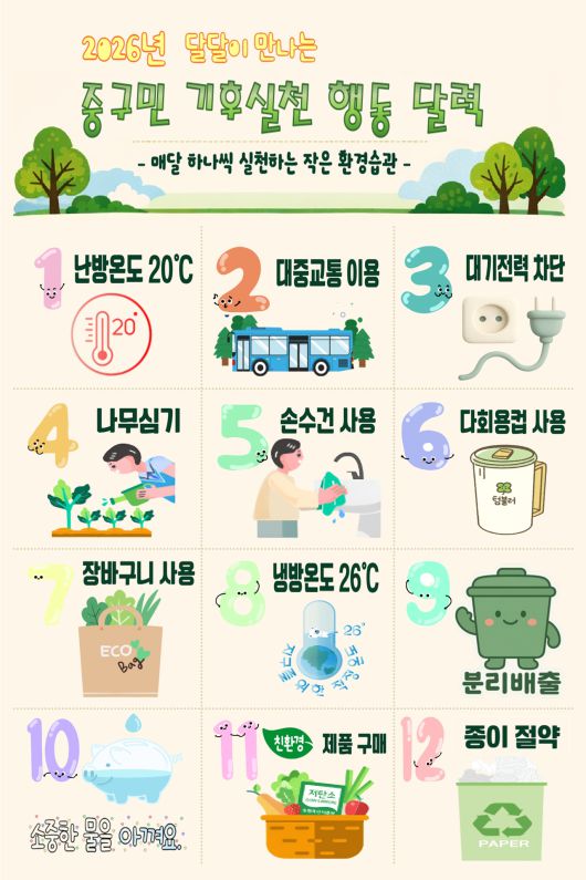 2026년 달달이 만나는 중구민 기후실천 행동 달력으로, 매달 하나씩 실천하는 작은 환경습관을 이미지로 표현한 포스터이다. 1월 난방온도 20도 유지, 2월 대중교통 이용, 3월 대기전력 차단, 4월 나무심기, 5월 손수건 사용, 6월 다회용 컵 사용, 7월 장바구니 사용, 8월 냉방온도 26도 유지, 9월 분리배출, 10월 물 절약, 11월 친환경 제품 구매, 12월 종이 절약을 나타낸 그림들이 나열되어 있다. |