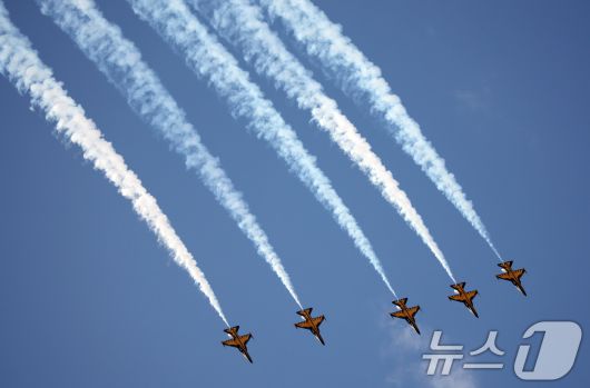 17일 경기 성남시 수정구 서울공항에서 열린 '서울 국제 항공우주 및 방위산업 전시회'(서울 ADEX 2025)'에서 공군 특수비행팀 블랙이글스가 화려한 에어쇼를 선보이고 있다. 2025.10.17/뉴스1 ⓒ News1 김영운 기자 |