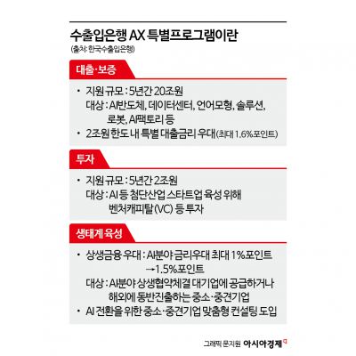 수출입은행은 22일 AX특별프로그램을 출시한다고 밝혔다. 이 프로그램은 ▲대출 및 보증 ▲투자 ▲생태계 육성 등 세 분야를 중심으로 AI 기업을 지원한다. 우선 대출 및 보증 프로그램에 20조원을 투입한다. 고대역폭메모리(HBM) 등 반도체뿐 아니라 데이터센터를 비롯한 인프라 분야에서부터 핵심언어모형(LLM) 개발과 AI솔루션·로봇·AI팩토리 구축 등 활용단계에 이르는 AI 산업 전 분야 기업이 대상이다. 특히 2조원 한도 내에서 대기업은 최대 1.2%포인트, 중소·중견기업은 1.4%포인트까지 금리를 우대한다. 비수도권에 위치한 중소·중견기업은 0.2%포인트를 추가해 최대 1.6%포인트까지 금리를 인하한다.