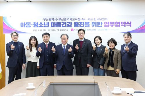 (부산=연합뉴스) 김선호 기자 = 부산시는 22일 오후 시청 국제의전실에서 교육청, 유니세프 한국위원회와 아동·청소년 마음 건강 증진 업무협약을 체결한다.