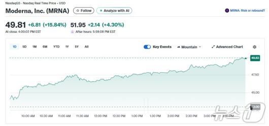 21일(현지 시각) 뉴욕증시에서 모더나는 15.84% 폭등한 49.81달러를 기록했다. 이는 52주 신고가다.
