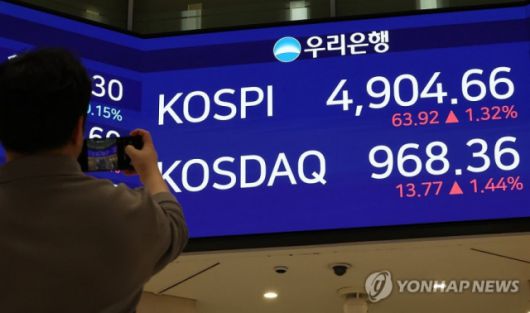 코스피가 22일 미국 증시 급반등에 힘입어 '오천피'(5000포인트)에 바짝 다가설 전망이다. 프리장에서 삼성전자(005930)SK하이닉스(000660)가 3%대 상승하면서 지수도 2%대 상승세를 나타내고 있다.