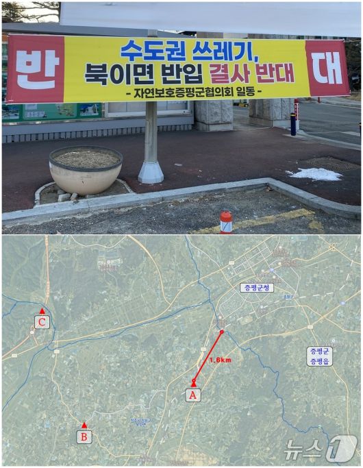 충북 증평군에 내걸린 수도권쓰레기 반입금지 현수막과 증평 인근 쓰레기 소각장 위치도.(진천군 제공, 재판매 및 DB금지)/뉴스1 |