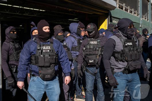 경찰과 미국 이민세관단속국(ICE) 요원들이 29일 뉴욕시 맨해튼 구역의 일반 서비스 관리국(GSA) 주차장 근처에 사람들이 모이는 것을 지켜보고 있다. 2025.11.29 ⓒ 로이터=뉴스1 ⓒ News1 강민경 기자 |