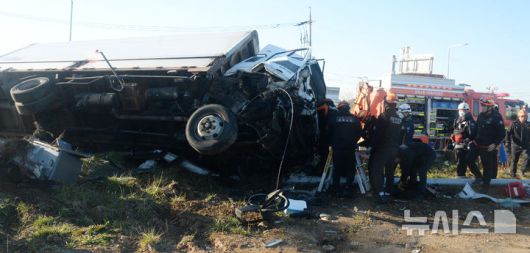 [군산=뉴시스] 김얼 기자 = 30일 전북 전주-군산 자동차전용도로 군산시 내초동 옥녀교차로에서 대형 화물차와 1t 트럭의 사고가 발생해 소방관들이 구조작업을 하고 있다. 2025.12.30. pmkeul@newsis.com |