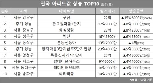 이 밖에도 경기 성남시 ‘양지마을3단지금호5단지·한양’, 서울 양천구 ‘목동신시가지1단지’, 서초구 ‘방배타운하우스’, 동대문구 ‘래미안허브리츠’, 송파구 ‘씨티극동’ 등이 전국 아파트값 상승 상위 10위권에 포함됐다.