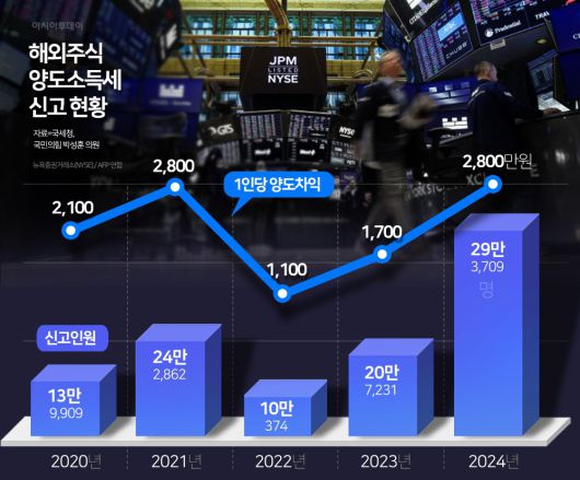 아시아투데이 정아름 기자 = 해외주식 투자로 차익을 얻어 양도소득세를 신고한 투자자가2024년 처음으로 50만 명을 넘어섰다.