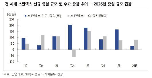 스판덱스 수급 여건도 개선 국면에 진입했다는 분석이다. NH투자증권에 따르면 올해 글로벌 스판덱스 수요는 연평균 6~8% 성장하며 약 8만~11만 톤 증가할 것으로 예상되는 반면, 신규 증설 규모는 최대 약 3만 톤에 그칠 전망이다. 최 연구원은 “다운사이클이 4년 이상 장기화되며 한계 기업이 나타나고 있고, 최근 중국 내 점유율 약 16%, 생산능력 22만5000톤 규모 기업의 파산 가능성까지 부각되고 있다”며 “공급 부담은 명확히 줄어들 것”이라고 말했다.