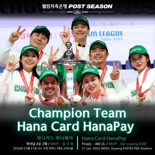 하나카드는 21일 경기도 고양시에 있는 킨텍스 PBA 스타디움에서 열린 ‘웰컴저축은행 PBA 팀리그 2025~2026 포스트시즌’ 파이널(7전 4선승제) 6차전에서 세트스코어 4-1로 승리, 시리즈 전적 4승2패를 기록하며 정상에 섰다.