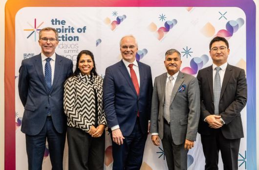 (왼쪽부터) 존 아른 로팅겐 웰컴트러스트 최고경영자(CEO), 프리야 아그라왈 MSD Health Equity & Partnerships 부문 부사장, 리차드 헤쳇 전염병대비혁신연합(CEPI) CEO, 라만 라오 힐레만연구소 CEO, 김익중 SK바이오사이언스 BD2실장이 21일(현지 시각) 스위스 다보스에서 개최된 세계경제포럼(WEF)에서 차세대 자이르 에볼라 백신 개발 펀딩 및 협력에 대해 발표한 후 기념촬영을 하고 있다./SK바이오사이언스 |
