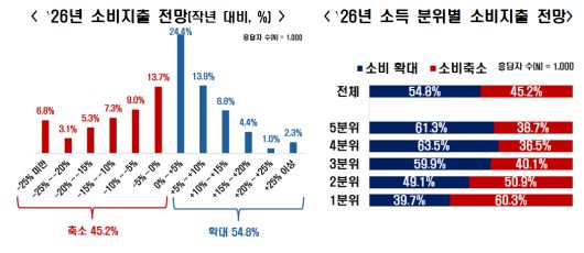 소득 분위별로 보면 하위 40%(1∼2분위)는 올해 소비를 작년에 비해 줄일 것이라는 응답이, 상위 60%(3∼5분위)는 소비를 늘릴 것이라는 응답이 다수를 차지했습니다.