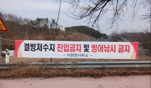 이번 현수막 설치는 이원면 소재 소류지 12곳과 개심저수지 2곳, 장찬저수지 4곳 등 총 18곳을 대상으로 추진됐으며, '결빙 시 저수지 진입금지' 문구를 통해 위험 요소에 대한 경각심을 높이고 있다.