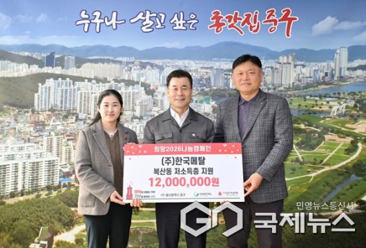 (울산=국제뉴스) 주영곤 기자 = ㈜한국메탈(대표 이정우)이 지난 21일 중구청 구청장실을 방문해 울산사회복지공동모금회를 통해서 이웃돕기 후원금 1,200만 원을 전달했다.