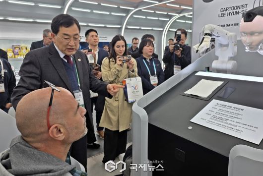 (제공=경주시) 해외 관계자들과 함께 첨단 로봇 기술이 적용된 전시 제품을 살펴보며 설명을 듣고 있는 주낙영 경주시장 |