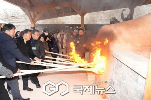 옹기문화마당 준공식 참석자들이 전통가마에 불을 붙이는 모습 [사진제공=중랑구청] |