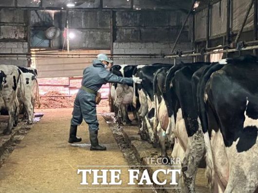 경기도에서 활동 중인 한 산업동물 공수의사가 젖소들을 상대로 결핵병 공동 검진을 진행하고 있다. /경기도 |