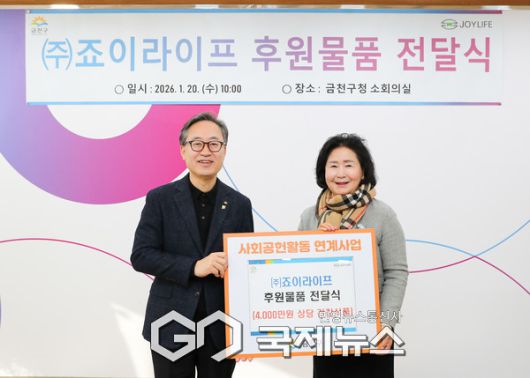 이와 관련 지난 20일 오전 금천구청 소회의실에서 후원물품 전달식이 진행됐다. 전달식에서는 유성훈 금천구청장과 정난희 ㈜죠이라이프 대표가 참석해 관내 취약계층 지원에 뜻을 모았다.