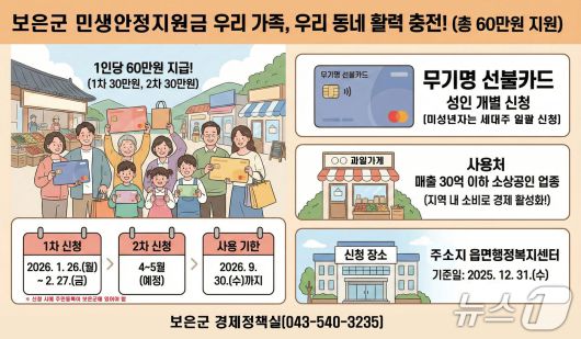 1인당 60만 원(1차 30만 원, 2차 30만 원)을 무기명 선불카드로 지급한다.