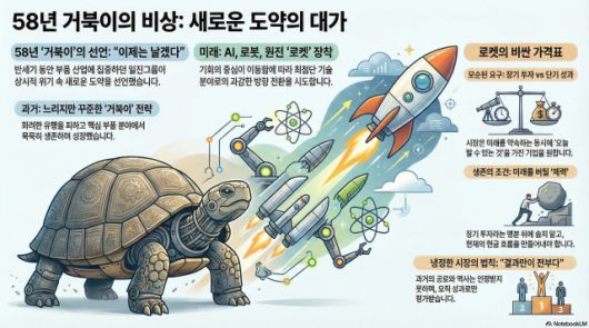 58년 된 거북이는 자신이 더 이상 느린 안전지대에 머물 수 없다는 걸 안다. 날기 위해서는 깃털이 아니라, 돈·기술·사람·시간을 갈아 넣어야 한다는 것도 안다. 그 대가를 치를 준비가 돼 있느냐는 질문이 이제 남았다. 시장은 늘 이렇게 말해왔다. “살아남은 이유는 설명해주지 않는다. 탈락한 이유만 분명히 보여줄 뿐이다.”