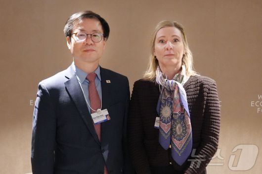 (서울=뉴스1) = 여한구 산업통상부 통상교섭본부장이 20일(현지시간) 스위스 다보스에서 열린 '2026 세계경제포럼 연차회의'에서 라스무스 에르보 오스테드 CEO와 면담 후 기념촬영을 하고 있다. (산업통상부 제공. 재판매 및 DB 금지) 2026.1.22/뉴스1