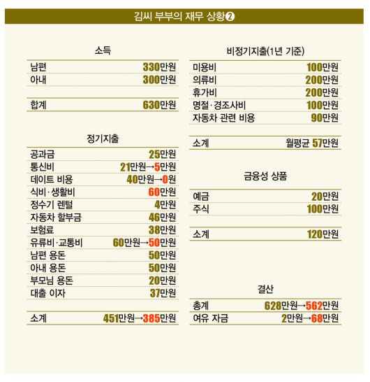 이렇게 1차 지출 줄이기를 마쳤다. 부부는 데이트 비용 40만원(40만→0원), 통신비 16만원(21만→5만원), 유류비ㆍ교통비 10만원(60만→50만원) 등 66만원을 줄이는 데 성공했다. 여유 자금도 2만원에서 68만원으로 꽤 많이 불어났다.