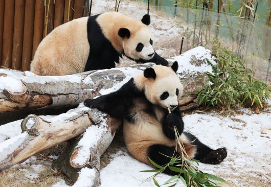 15일 경기도 용인시 에버랜드에서 쌍둥이 판다 루이바오와 후이바오가 눈 위에서 먹이를 먹으며 장난치고 있다. <연합뉴스> |