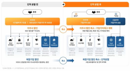 ㈜한화는 인적분할 핵심 목적으로 사업 포트폴리오 최적화를 통한 '복합기업 디스카운트 해소'를 꼽았다. 존속법인과 신설법인 사업 정체성을 명확히 하고 각 사업군별 전략·투자를 최적화해 시장 재평가를 유도한다는 복안이다.
