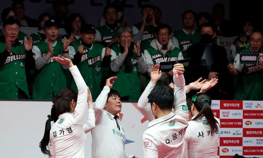 하나카드 선수들이 승리 후 환호하고 있다. PBA 제공 |