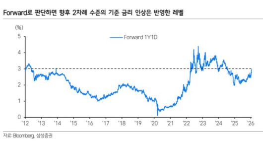 김 애널리스트는 Forward 금리로 봐 향후 2차례 수준의 기준 금리 인상은 이미 반영한 레벨로 분석했다. 그는 "현 수준의 금리면 여러 악재를 감안해도 추가로 상승할 수 있는 폭은 제한적일 가능성이 크다"고 보았다.