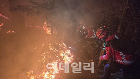 당국은 해가 뜨는 오전 7시 30분부터 야간 진화체제를 해제하고, 헬기 26대를 순차 투입해 진화 중이다. 전날 야간 진화 작업에는 열화상 카메라를 장착한 수리온 헬기도 처음으로 투입돼 현장 상황을 파악하는 데 사용됐다.